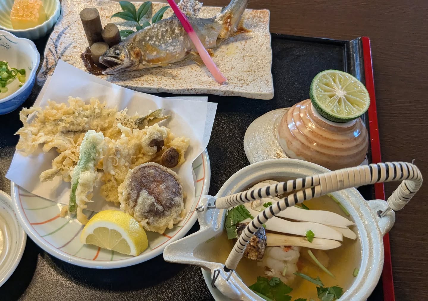 春には山菜料理、夏には鮎、秋にはきのこ料理、冬にはしし鍋と地元の食材を使った料理には