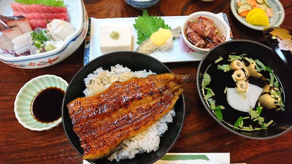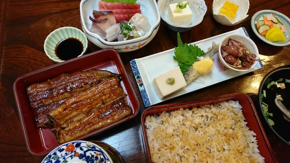 うな丼、お刺身、季節の前菜、お吸物、小付け、お新香、水菓子