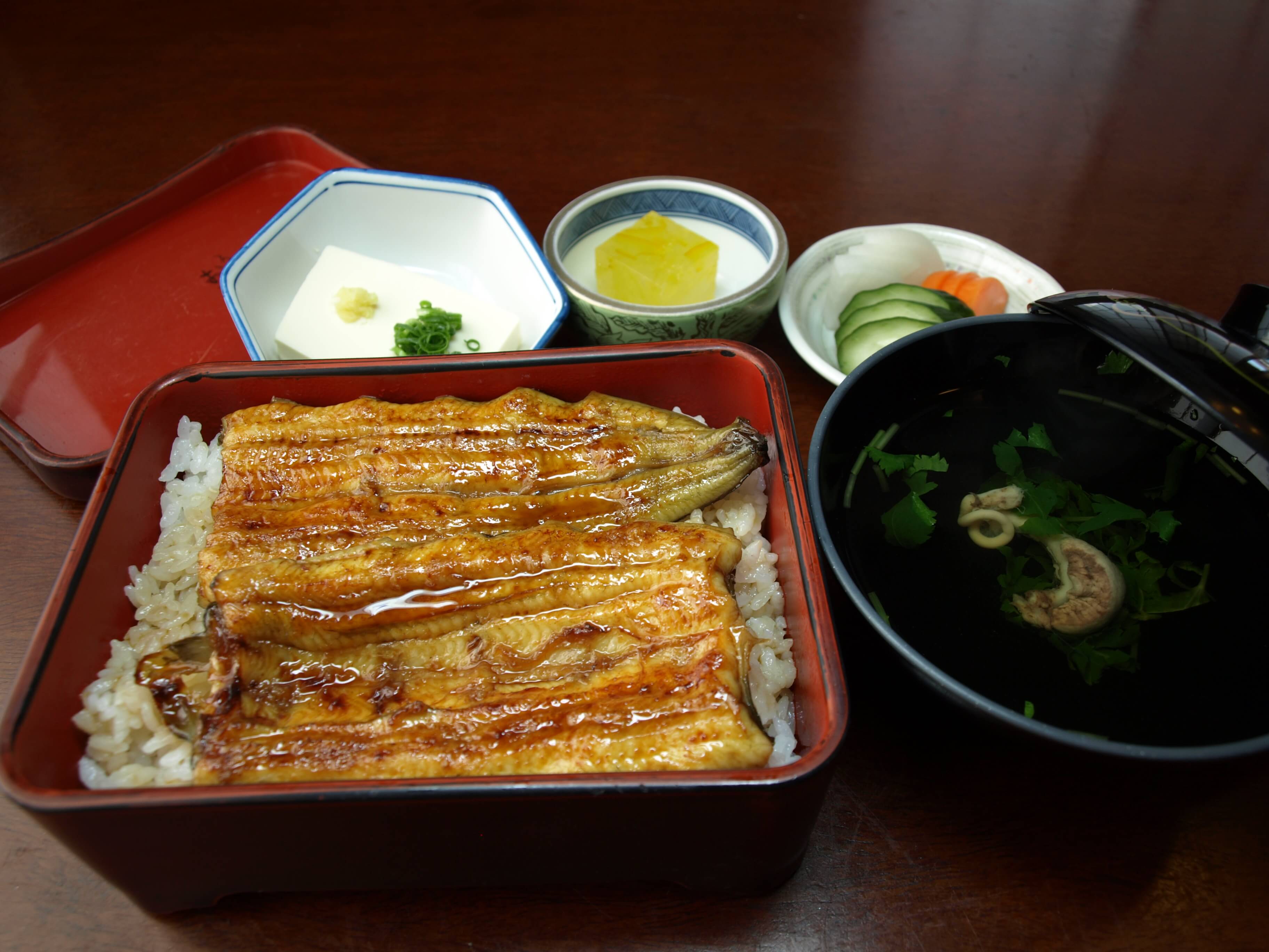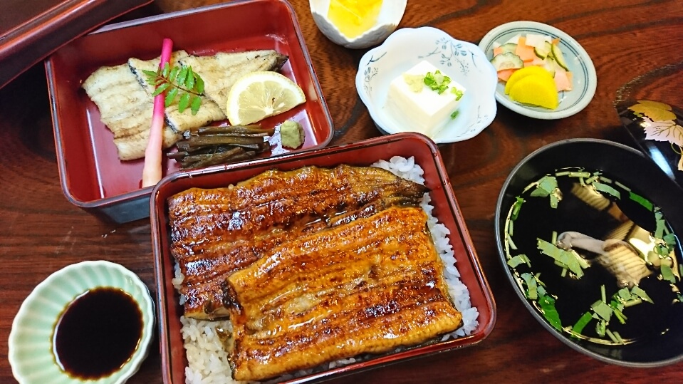 鰻白焼き(半分)、うな重(一匹分)、小付け、肝吸い、お新香、水菓子