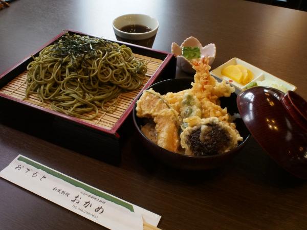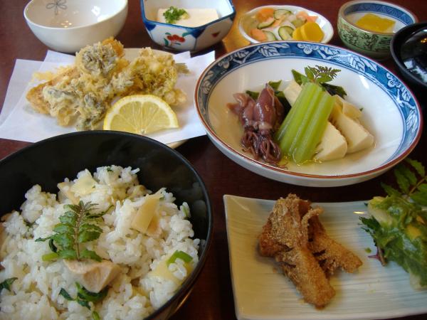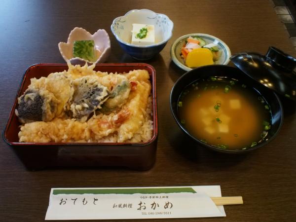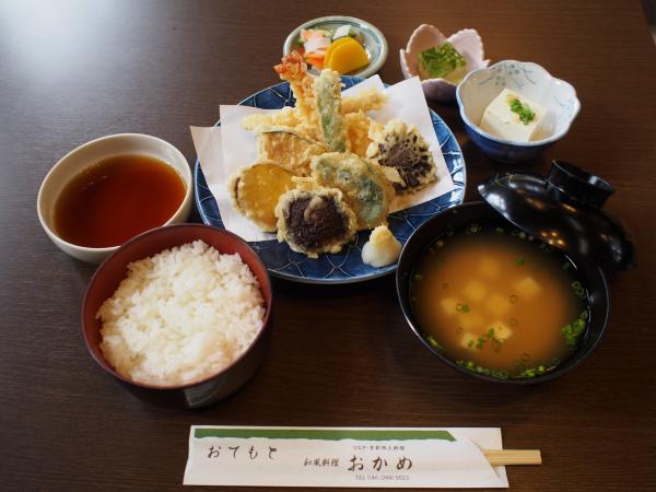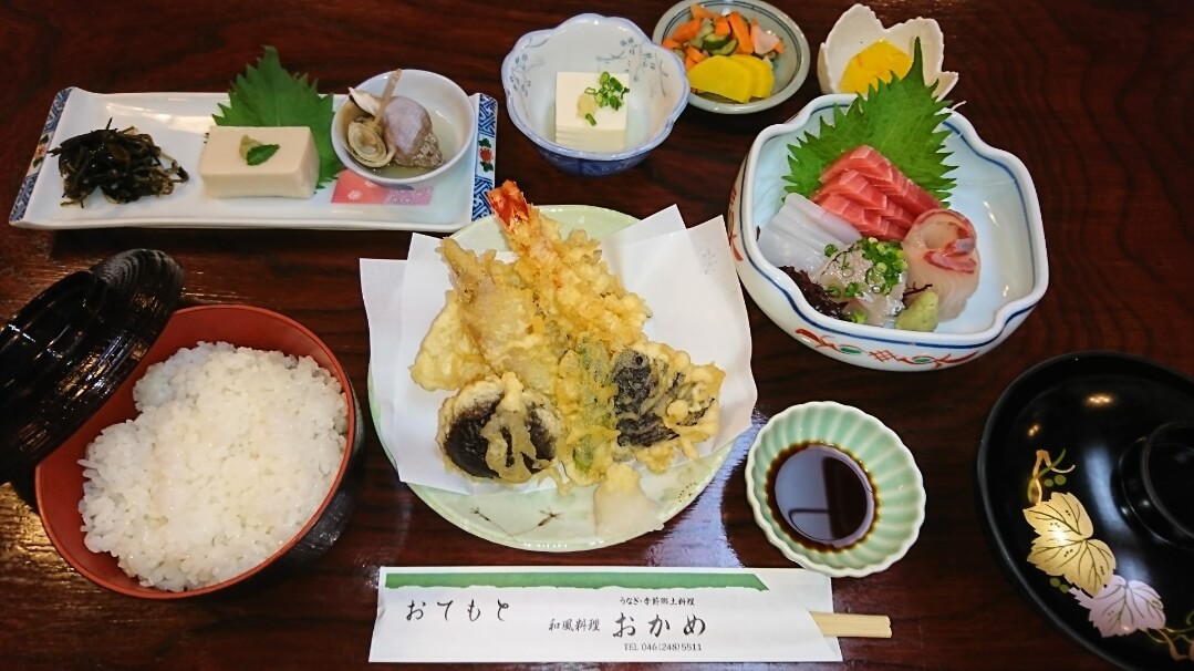 天ぷら、お刺身、小付け、季節の前菜、御飯、味噌汁、お新香、水菓子
